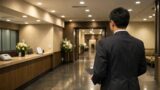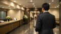 清潔感のある現代的な葬儀ホールの受付付近で、礼儀正しい若手の葬儀社スタッフが穏やかな表情で立っている 葬儀社