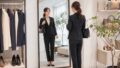 日本人女性がブラックフォーマルのワンピースとジャケットを鏡の前で確認している実写風写真 服装